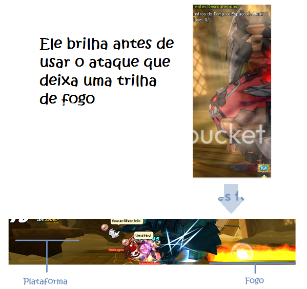 Trilha de fogo: Ele dá um giro (cuidado que ele acerta na frente e nas costas dele) de fogo e cria uma trilha de fogo no chão. Fique em cima das plataformas para atacar, evite pisar no chão em que está pegando fogo, pq causa queimadura.