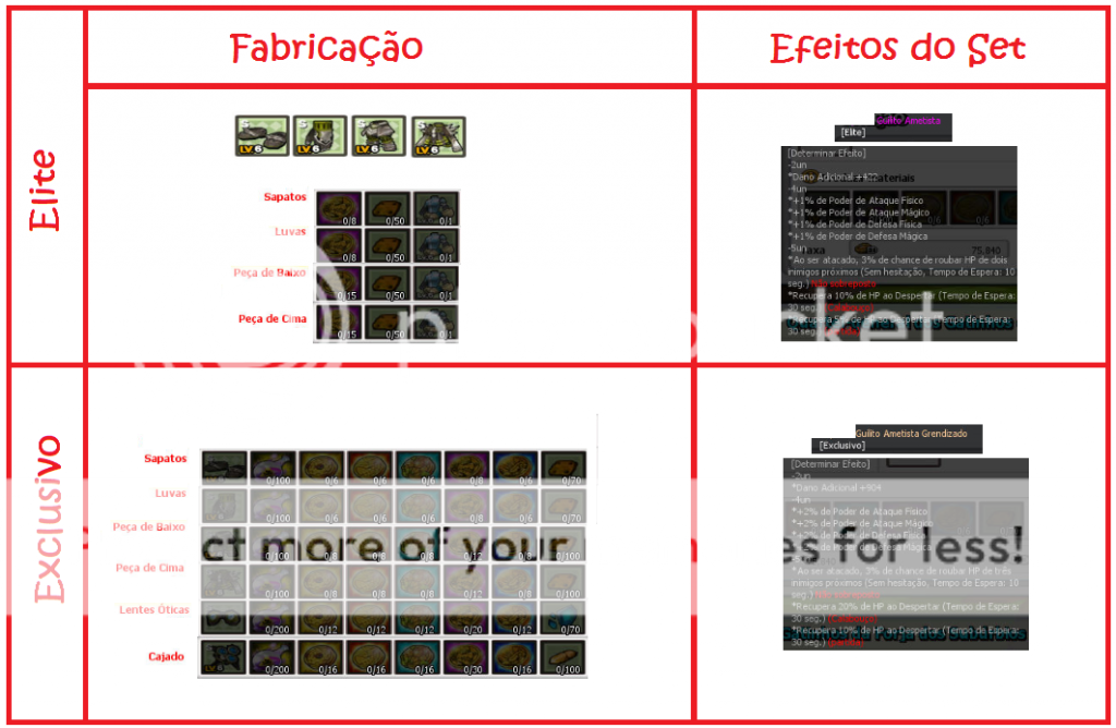 Também é possível obtê-lo por fabricação nos ferreiros, com exceção da arma e do acessório. Também é possível transformar o elite em exclusivo (no próprio ferreiro), o set exclusivo é de nível 70.